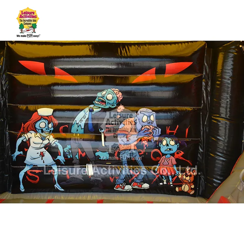 Pequeños castillos hinchables inflables multijugador encantados con tobogán: este inflable "Combo encantado" con temática zombi está diseñado para cautivar a los niños con su emocionante estética de dibujos animados de terror. La audaz combinación de rojos intensos, negros brillantes y verdes y azules espeluznantes crea un ambiente vívido y emocionante. Los gráficos grandes y divertidos de zombis de dibujos animados en poses dinámicas (como una enfermera, un personaje devorador de cerebros y un niño zombi con un osito de peluche) son más divertidos que aterradores. Los elementos interactivos como el gran zombi azul que se arrastra por el techo, las manos con garras que atraviesan las paredes y las cadenas/gráficos en las columnas despiertan el juego imaginativo. La estructura cerrada con una cubierta superior protectora proporciona sombra y protección contra la lluvia ligera, mientras que el tobogán cerrado aumenta la aventura. La altura de 10 pies lo hace versátil para uso tanto en interiores como en exteriores, y se adapta perfectamente a fiestas de Halloween, festivales de otoño, eventos de cumpleaños temáticos y diversión espeluznante en el patio trasero.